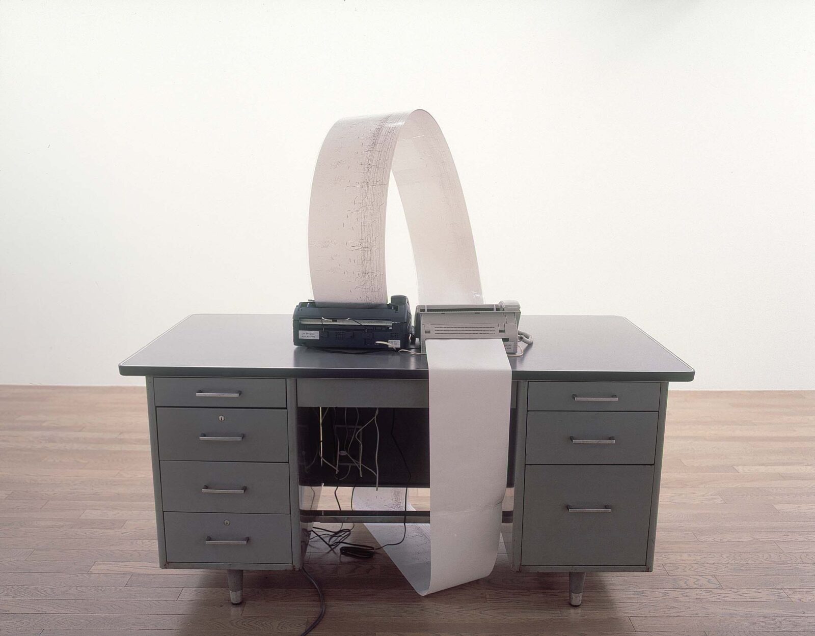 fax 69 involved connecting two fax machines together, each with its own unique telephone connection. Fax number one calls fax number two and commences sending a blank document to fax two. The resulting paper printout from the second fax is then eventually fed back into the first fax machine resulting in a closed information loop which runs partly via the public telephone exchange and partly via the physical paper printout